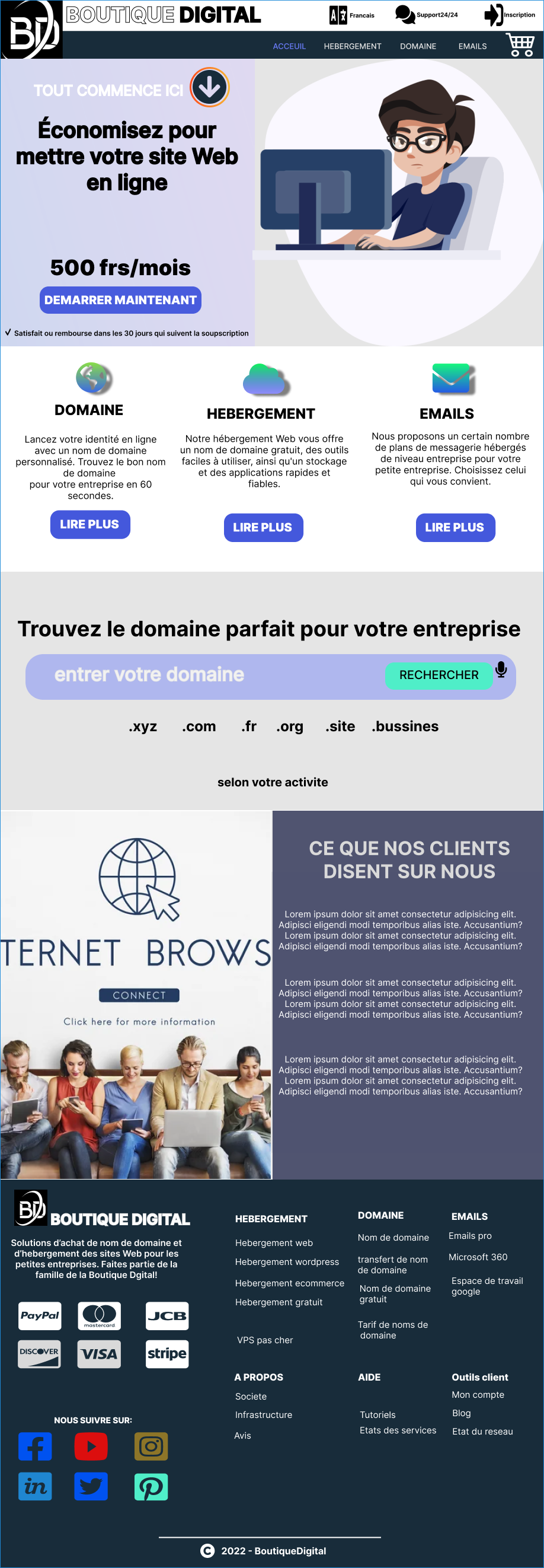 Conception des maquettes 2d et 3d ainsi le développement du site web d'hebergement et de vente de nom de domaine.